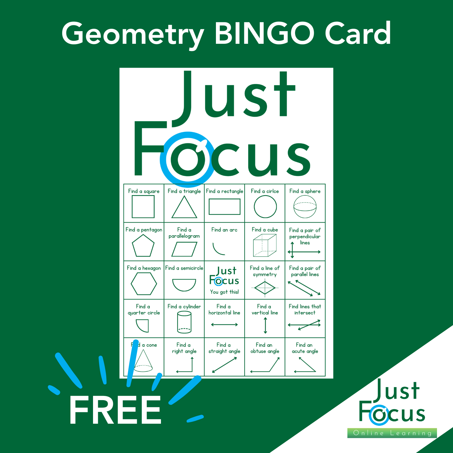 The Geometry BINGO Card is a fun, on-the-go learning tool featuring 2D and 3D shapes, types of line segments, and more. Print and laminate or slip into a sheet protector to use with a dry erase marker again and again. Perfect for waiting rooms, car rides, or quick geometry review anywhere!